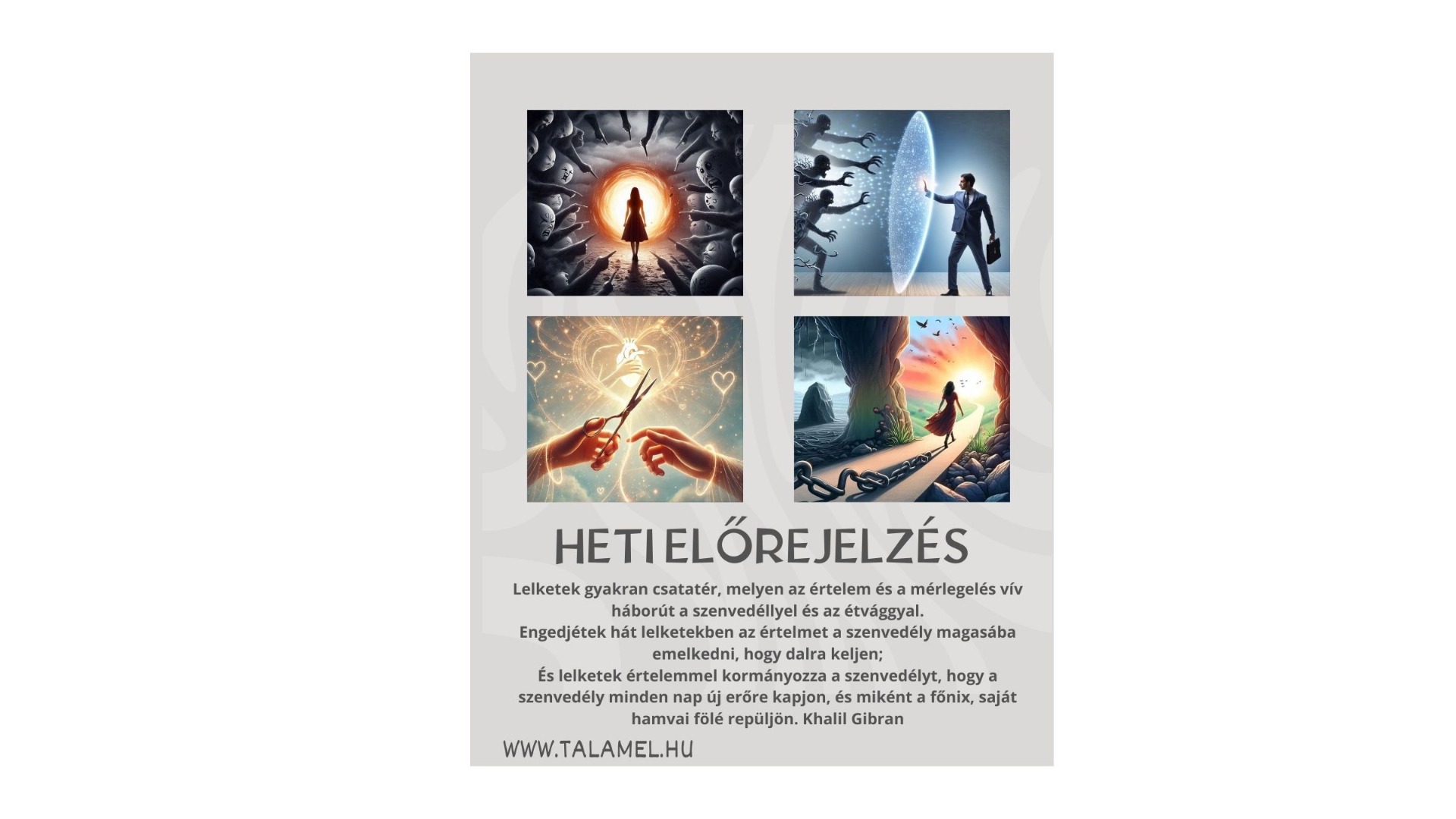 Engedjétek hát lelketekben az értelmet a szenvedély magasába emelkedni, hogy dalra keljen; És lelketek értelemmel kormányozza a szenvedélyt, hogy a szenvedély minden nap új erőre kapjon, és miként a főnix, saját hamvai fölé repüljön. Khalil Gibran